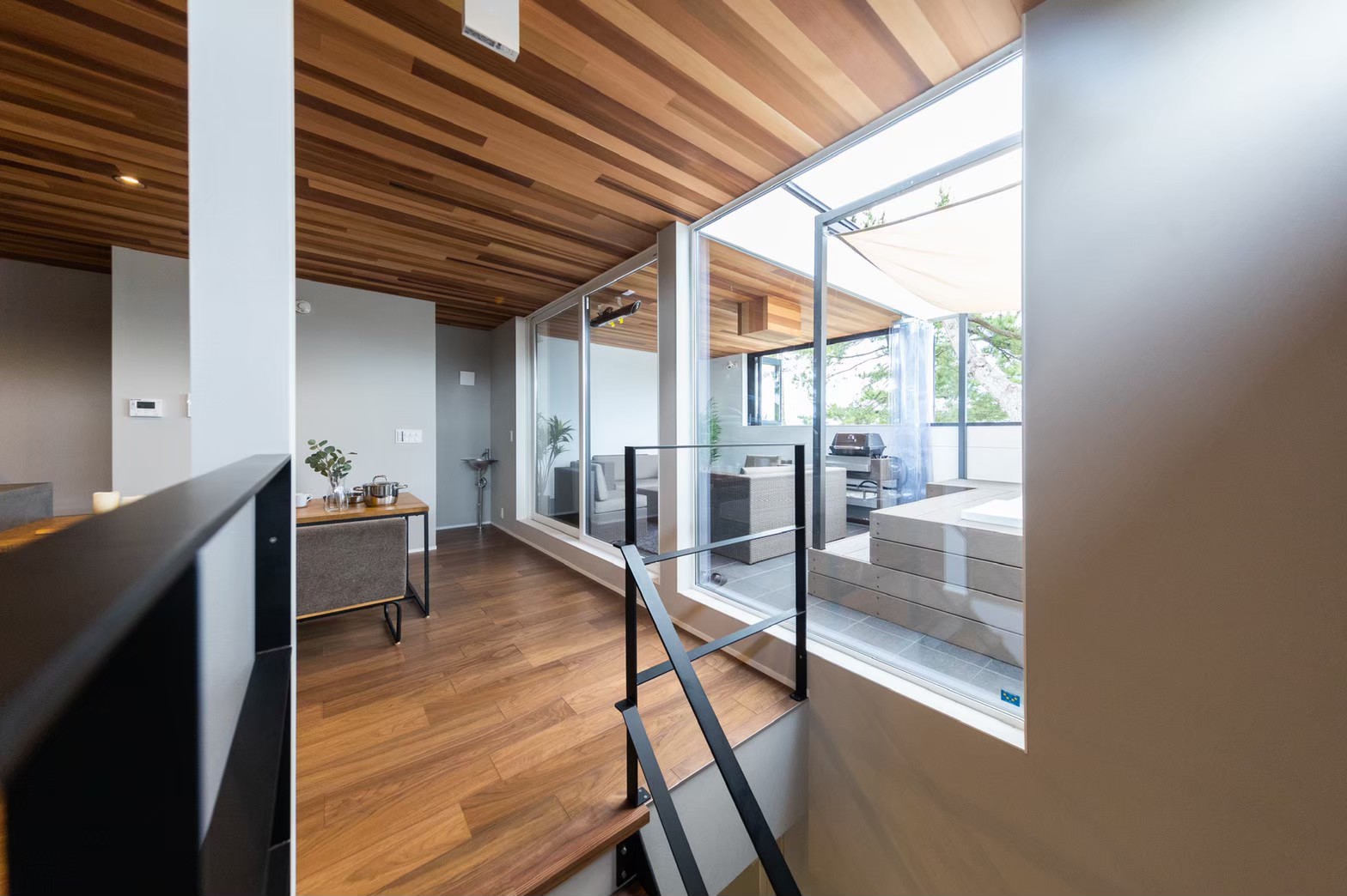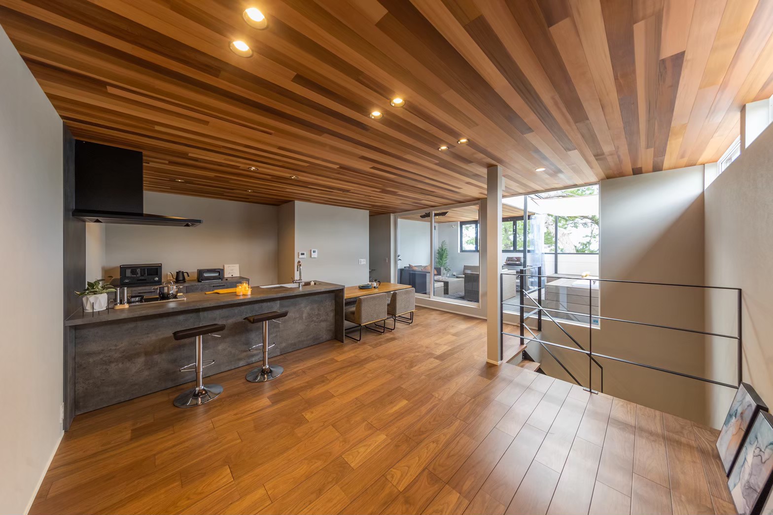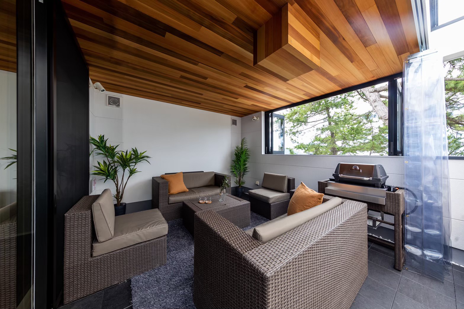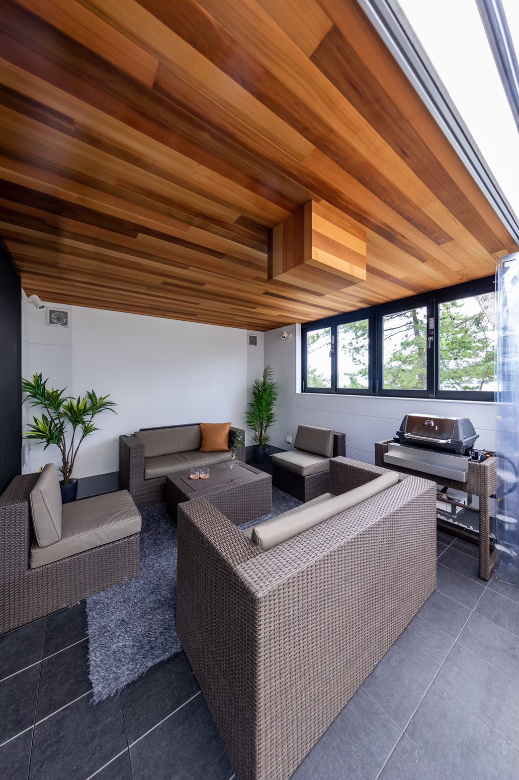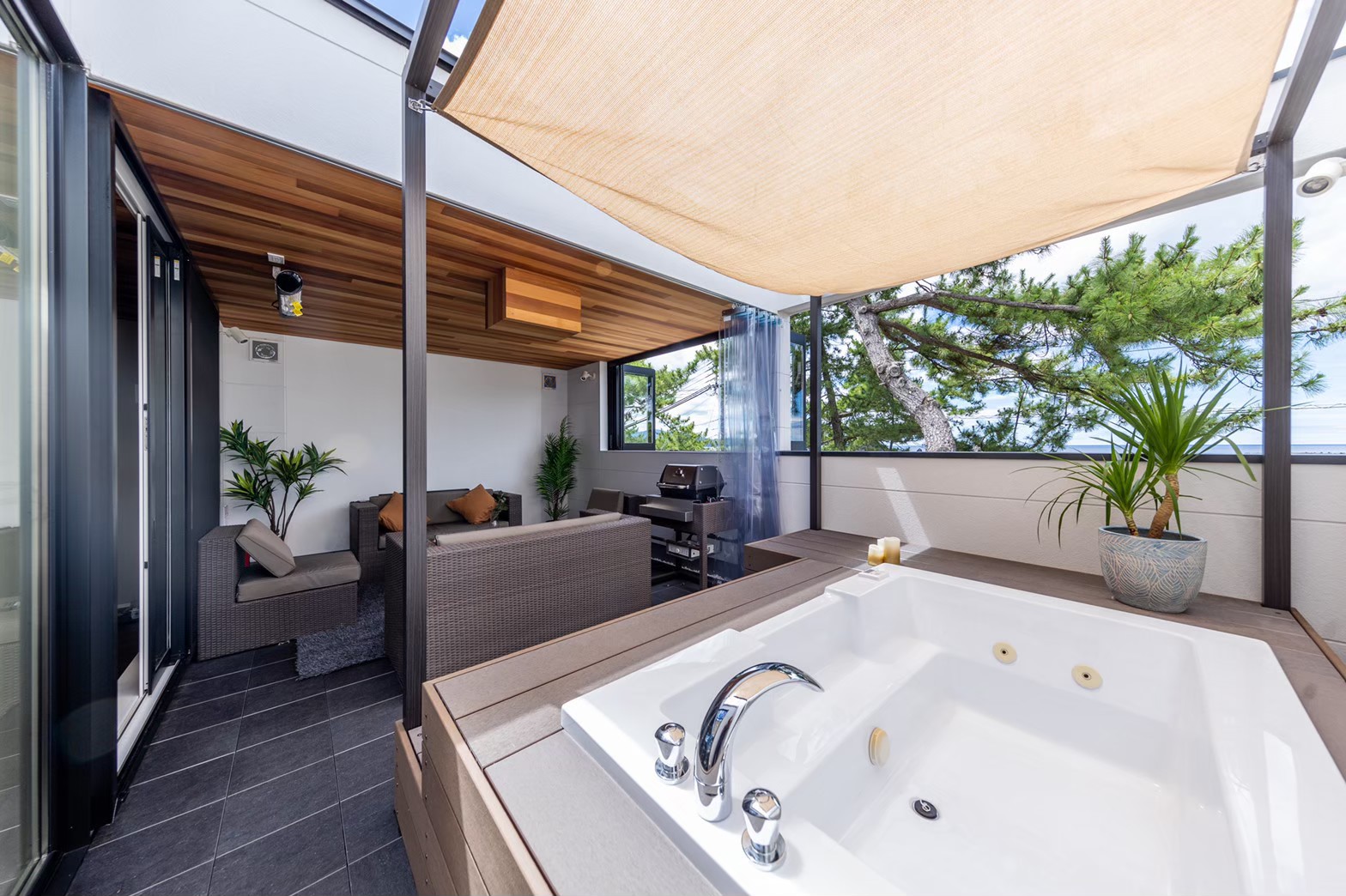 天候や季節に左右されない屋根付きのアウトドア・テラスがあります。