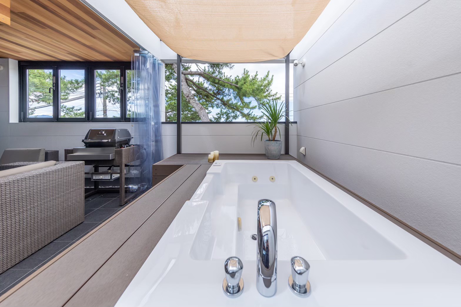 本格的なBBQが楽しめるガスグリルやジェットバスに浸かりながら、